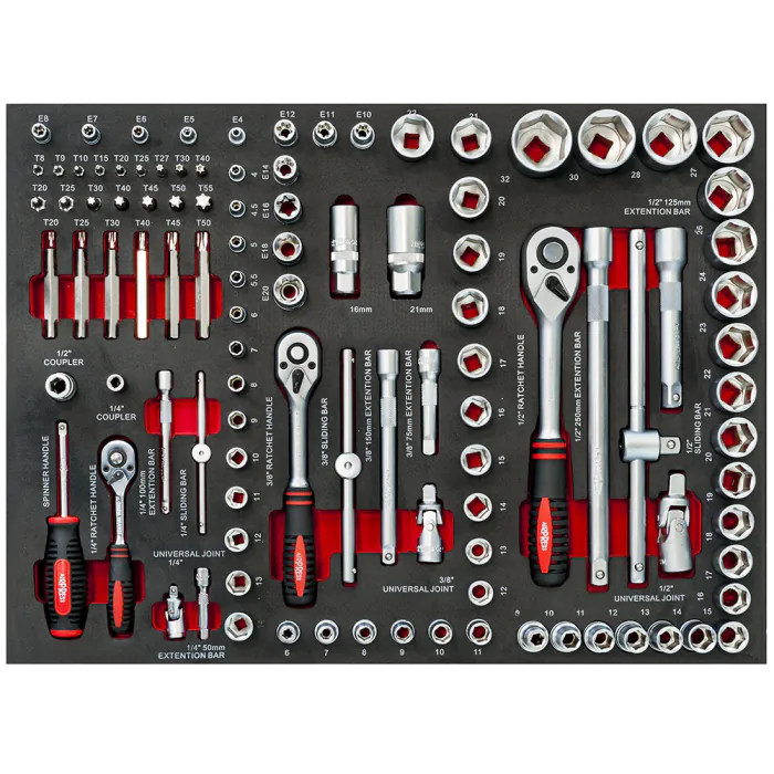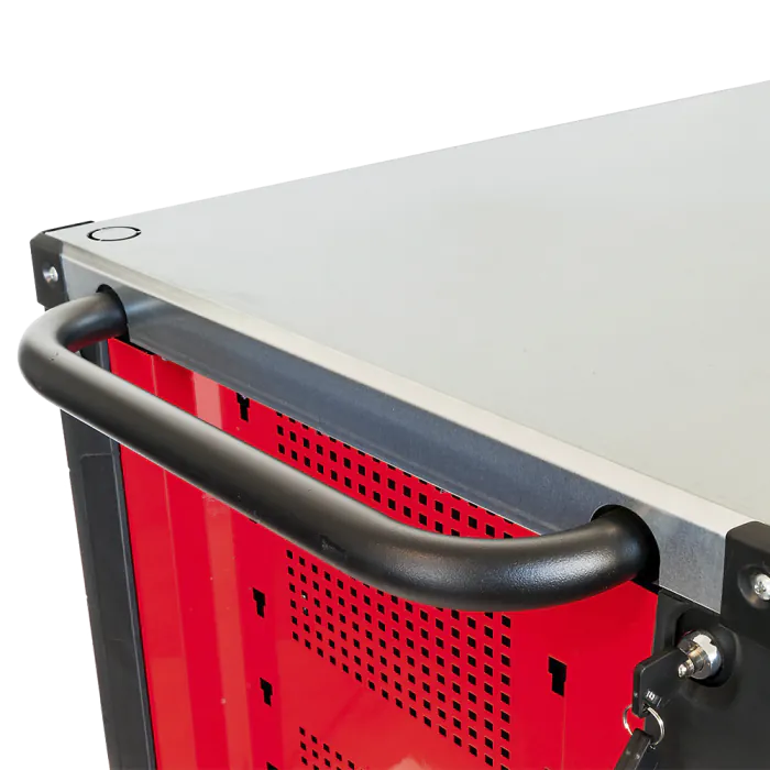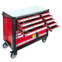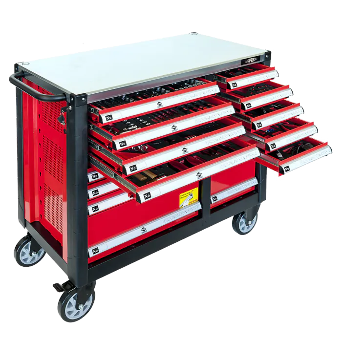 Gereedschapswagen van Airpress met 16 lades, gevuld met 447 delen! Erg robuuste wagen die lang mee gaat. De lades zijn te vergrendelen zodat u uw gereedschap veilig op kunt bergen. Met geperforeerde zijwand waardoor het mogelijk is om accessoires te monteren.