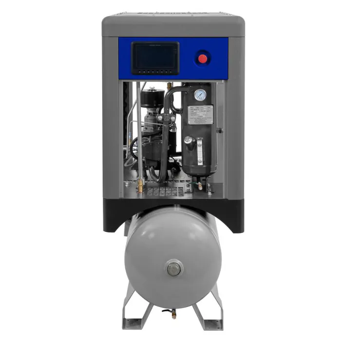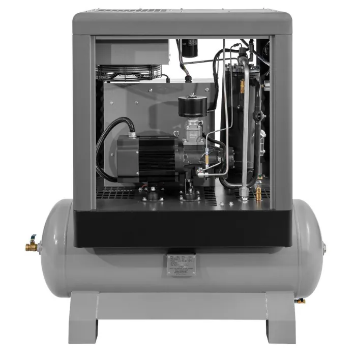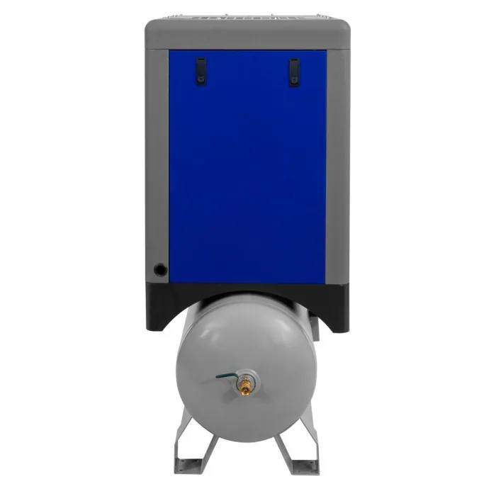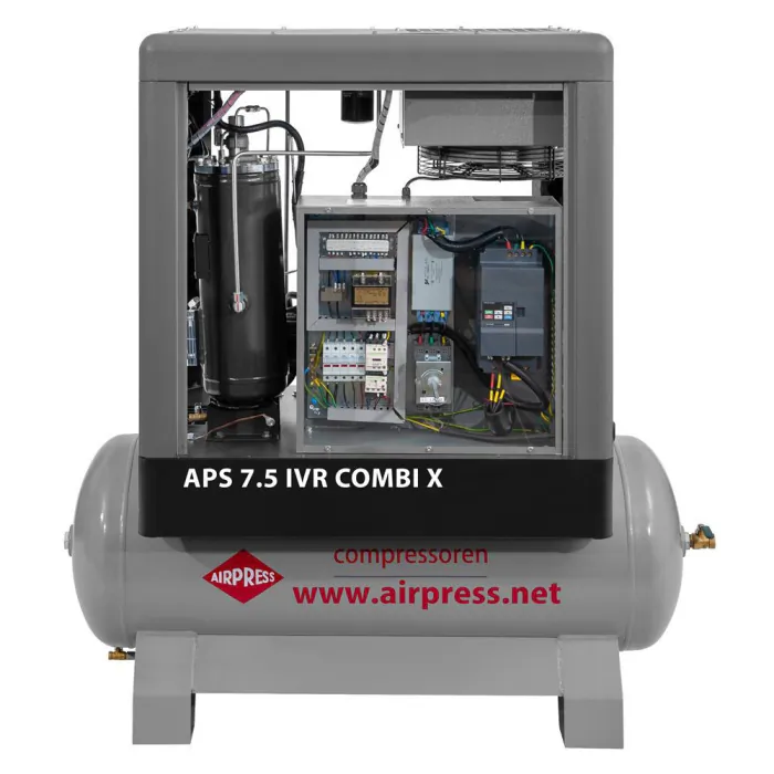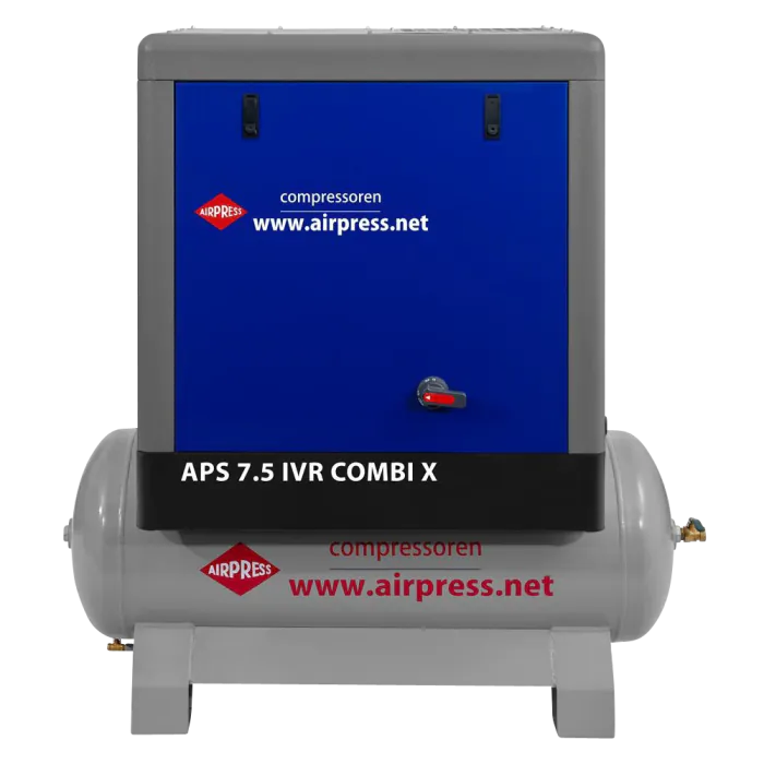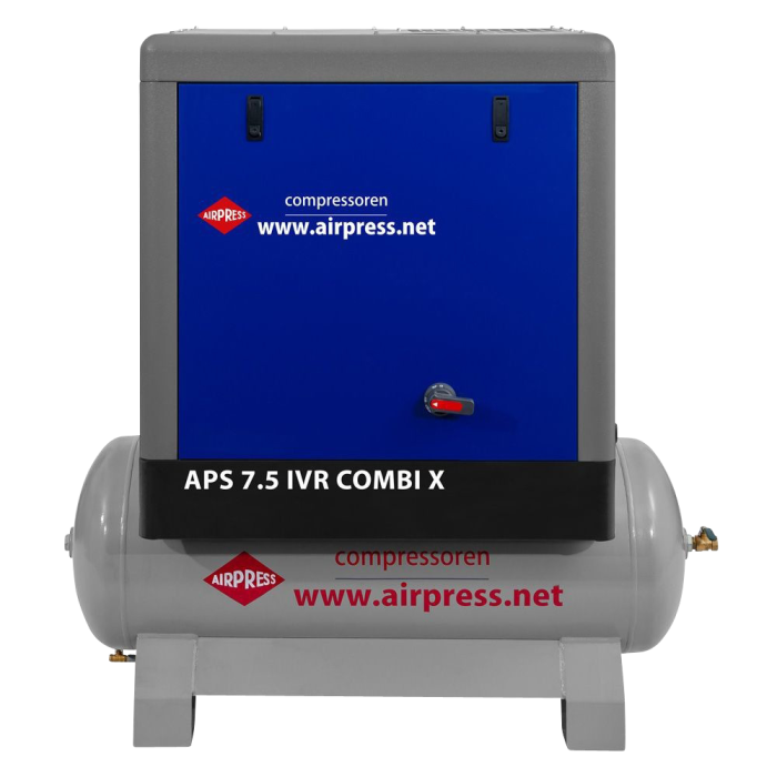 Airpress schroefcompressor APS 7.5 IVR COMBI X uit de nieuwe generatie schroefcompressoren. Deze extra compacte schroefcompressor heeft een vermogen van 7,5 pk met een capaciteit van 650 liter per minuut bij een werkdruk van 10 bar.