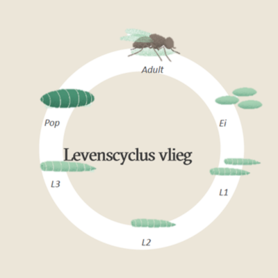 - Volwassen stalvlieg: volwassen vliegen zijn maar 20% van de hele vliegenpopulatie. De overige 80% zijn (bijna) onzichtbaar en nog in ontwikkeling als eitje, larve of pop. Deze zijn vooral te vinden in mest of voerresten.