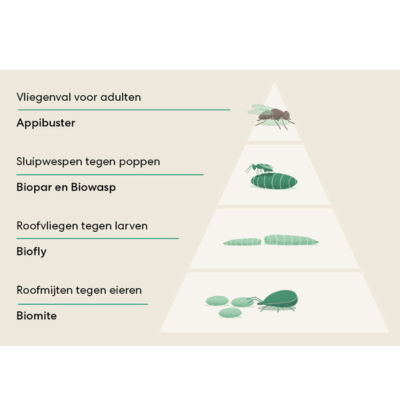 De stalvlieg heeft verschillende natuurlijke vijanden die ingezet kunnen worden bij het bestrijden van de stalvlieg op een natuurlijke manier. Wij bieden 3 natuurlijke vijanden van de stalvlieg aan;