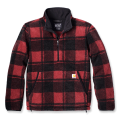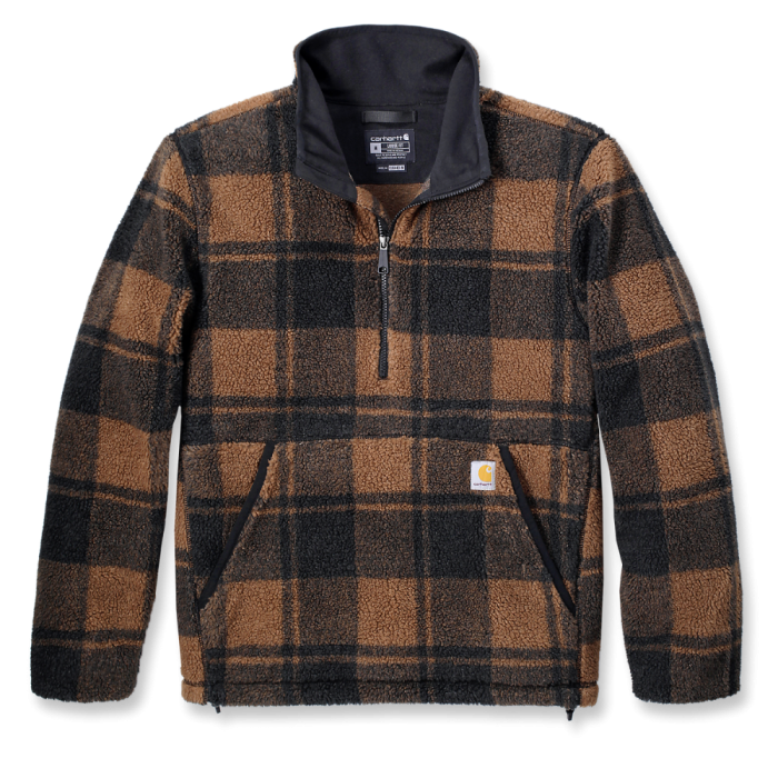 Deze fleecetrui van Carhartt heeft een hoge kraag met ritssluiting. De trui zorgt ervoor dat u warm blijft en heeft lage zakken aan de voorzijde die afsluitbaar zijn met een rits. Deze trui heeft een geblokt motief en een kastanjebruine met zwarte kleur. De 106443 trui is verkrijgbaar in de maten S t/m XXL.