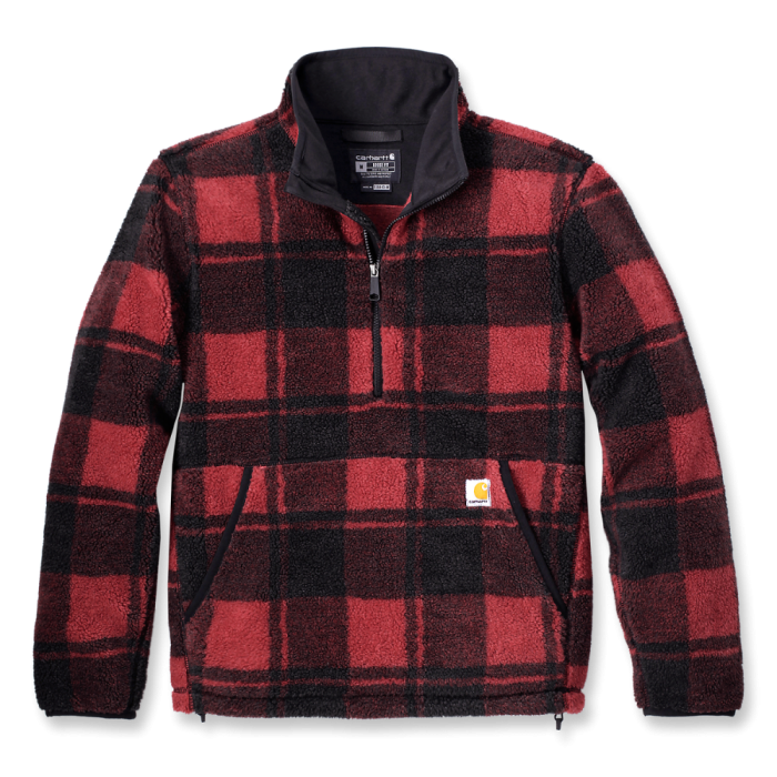 Deze fleecetrui van Carhartt heeft een hoge kraag met ritssluiting. De trui zorgt ervoor dat u warm blijft en heeft lage zakken aan de voorzijde die afsluitbaar zijn met een rits. Deze trui heeft een geblokt motief met een rood met zwarte kleur. Deze trui is verkrijgbaar in de maten S t/m XXL.