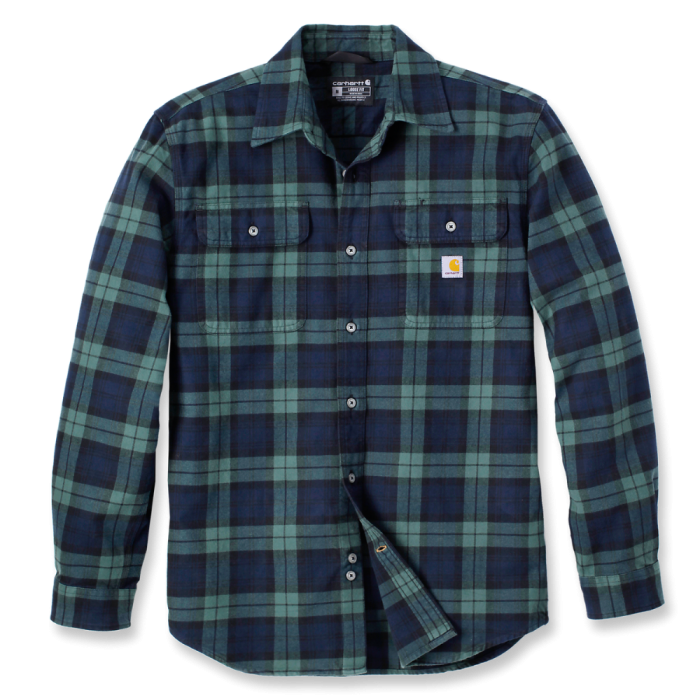 Dit groen/blauwe 106356 overhemd van Carhartt is een flanellen overhemd. De geruite blouse heeft een sluiting van knopen en bevat twee borstzakken. Dit overhemd is verkrijgbaar in de maten S t/m XXL.