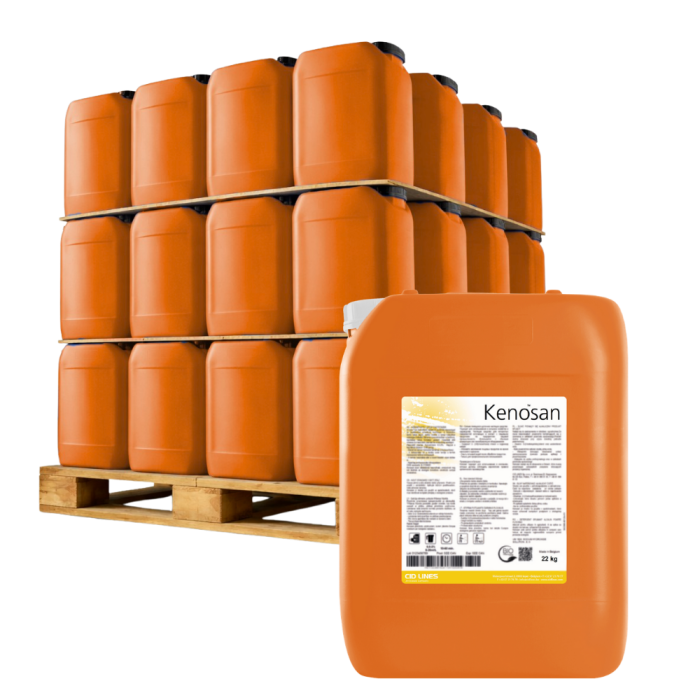 Kenosan van Cid Lines is een alkalisch schuimreinigingsmiddel welke een super schoon resultaat garandeert in de moeilijkste omstandigheden. Alkalische middelen worden gebruikt om dierlijke- en plantaardige vetten en eiwitten te verwijderen. Dit maakt Kenosan een onmisbaar product in de veehouderij. Dit middel combineert een ultrasterke hechtingskracht met een diep penetrerende reinigingsactie bij zeer lage concentraties! Zelfs het dikste vuil en opgedroogde mest en/of vuil maken geen kans tegen de oplossende kracht van Kenosan. De reinigende werking van dit middel wordt nog versterkt door de lange contacttijd (15 tot 30 minuten) als gevolg van lang hechtend schuim dat zich goed vasthecht op verschillende ondergronden. Ziet u dat het schuim van kleur (naar bruin) verandert? Dan doet dit het middel goed zijn werk. Kenosan is op meerdere oppervlaktes getest en is niet corrosief.