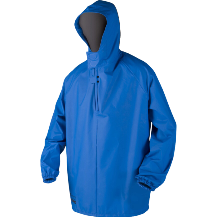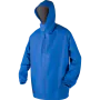 Regenjas van het merk Dolfing. Over het hoofd aan te trekken. Voorzien van drukknopen en elastiek in de mouwen. En een capuchon met kinbescherming. Verkrijgbaar in de maten S t/m 3XL met een blauwe kleur.