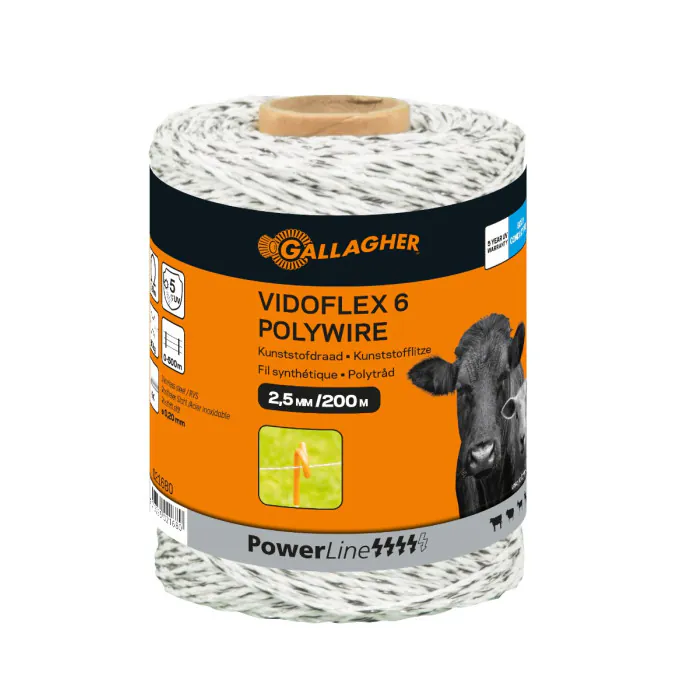 Schrikdraad Vidoflex 6 van Gallagher is de Powerline geleider met witte kleur. Geschikt voor semipermanente afrasteringen korter dan 500 meter. Powerline is een duurzame geleidende kunststofdraad voor korte afrasteringen voor uw schapen, geiten, runderen of wild. Op de rol zit 200 meter.