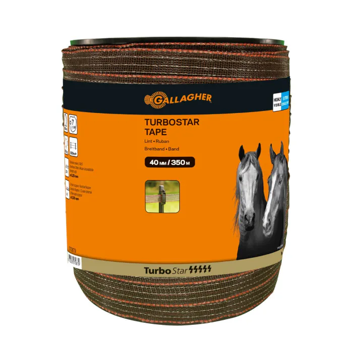 Terra/Bruin TurboStar lint van Gallagher met een breedte van 40mm. Het schriklint is uitermate geschikt voor lange, permanente paardenafrasteringen, langer dan 500 meter. Extra stevig en geleidt 40x beter dan standaard 40mm lint. Zeer hoge trekvastheid van maar liefst 520kg. Op de rol zit een lengte van 350 meter.