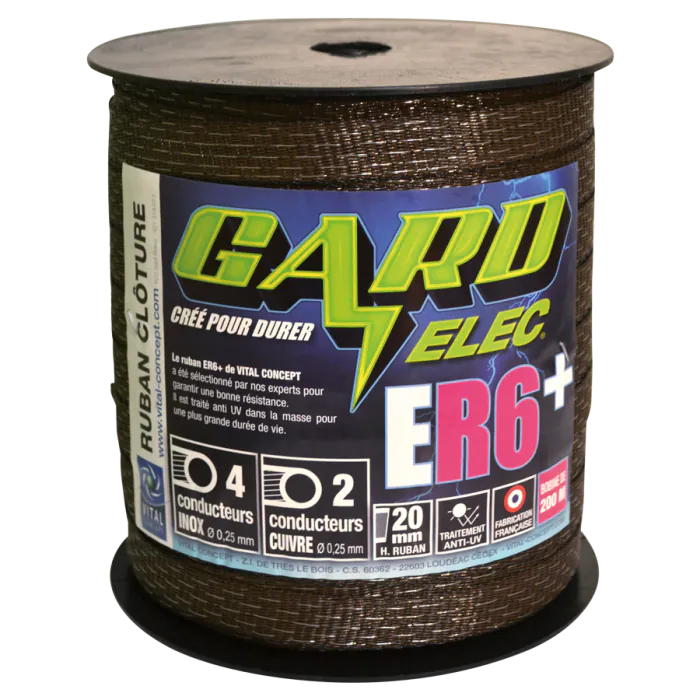 Op zoek naar een goed soort schriklint met terra kleur? Dan is deze rol met Gardelec ER6+ iets voor u! Het lint heeft een breedte van 20mm en is voorzien van 4 RVS draden 0,25mm en 2 koperdraden 0,25mm. Dankzij deze samenstelling heeft het een weerstand van 4,41 Ohm/m. Op de rol zit een lengte van 200 meter.