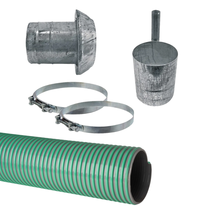 Naast een slang zit er in de complete set een bijbehorende slangklem met een breedte van 26mm en een dikte van 1.6mm. Voor een goede aansluiting wordt een mandeel koppeling met slangtule meegeleverd, ook wel m-deel, vaderdeel of v-deel genoemd. De bijbehorende putstuk zorgt ervoor dat er ruimte blijft tussen de slang en de bodem van de mestkelder of mestsilo.