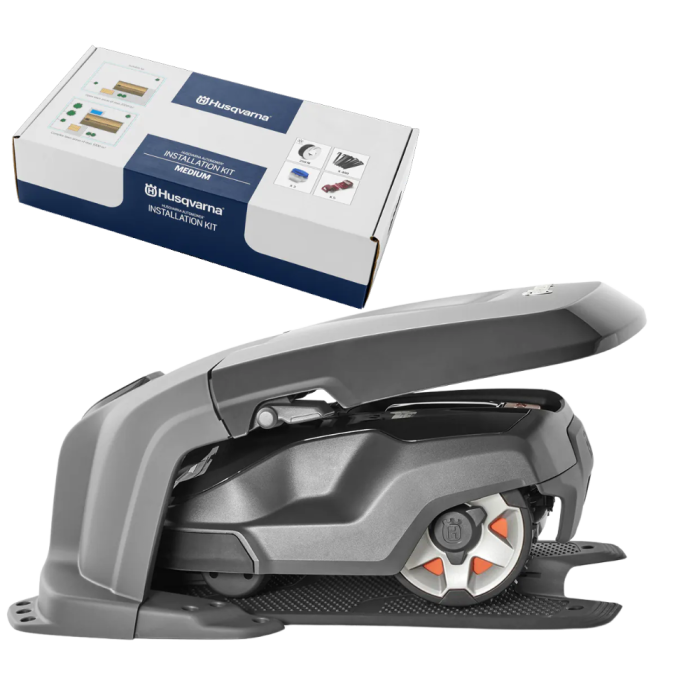Complete set bestaat uit de Husqvarna Automower 415X, een Automower garage en de volledige installatiekit.