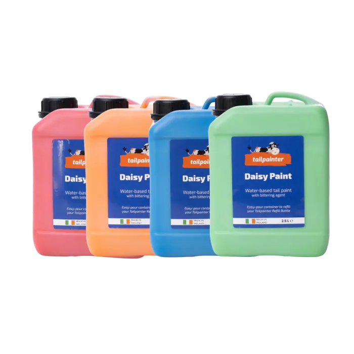 Grootverpakking Tailpainter Daisy Paint tochtdetectieverf met een inhoud van 2,5 liter. Geschikt om te gebruiken voor het herkennen van cyclussen en tochtigheid bij koeien. De 2,5 liter verpakking kunt u gebruiken voor het vullen van het 1 liter verfreservoir, die u gebruikt in combinatie met de Tailpainter applicator. De tochtdetectieverf wordt gebruik als een staartverf en is op waterbasis. Verkrijgbaar in rood, blauw, groen en oranje.
