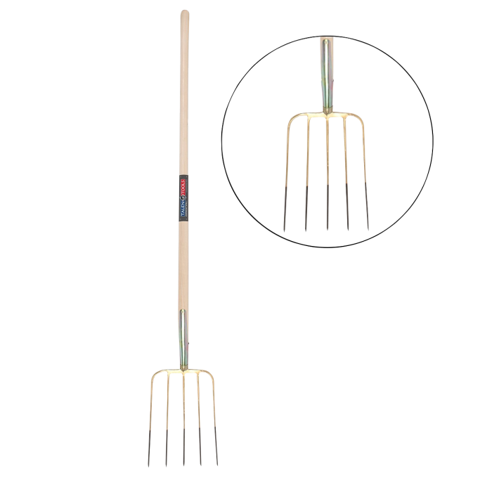 Brede 5 tands mestvork! De Talen Tools mestvork heeft 5 tanden. De ovalen tanden zijn gemaakt van sterk staal. De vork, ook wel riek, greep of griep genoemd, heeft een essenhouten steel van 130cm lang.