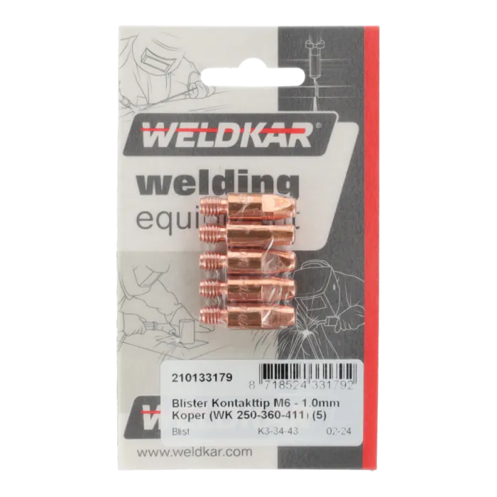 Contacttip kopen voor uw lastoorts? Deze Weldkar contacttips, ook wel laspit genoemd, hebben een M6 schroefverbinding en een diameter van 1.0 mm. Ze zijn gemaakt van koper en worden geleverd in een verpakking met 5 stuks.