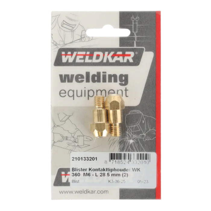 Zorg voor de juiste bevestiging van een contacttip met behulp van de Weldkar contacttiphouder. Deze houder heeft een M6 schroefdraadaansluiting, een lengte van 28,5 mm en is passend voor een MIG lastoorts 360. De verpakking heeft een inhoud van 2 stuks.